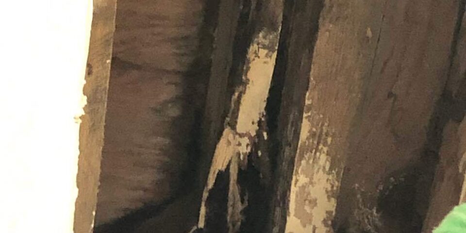 シロアリは木材の内部を食べ進めるため、外見はそのままでも中が空洞化していることがあります。そのため、柱や床板を軽く叩くと「ポコポコ」といった空洞音がするのが特徴です。